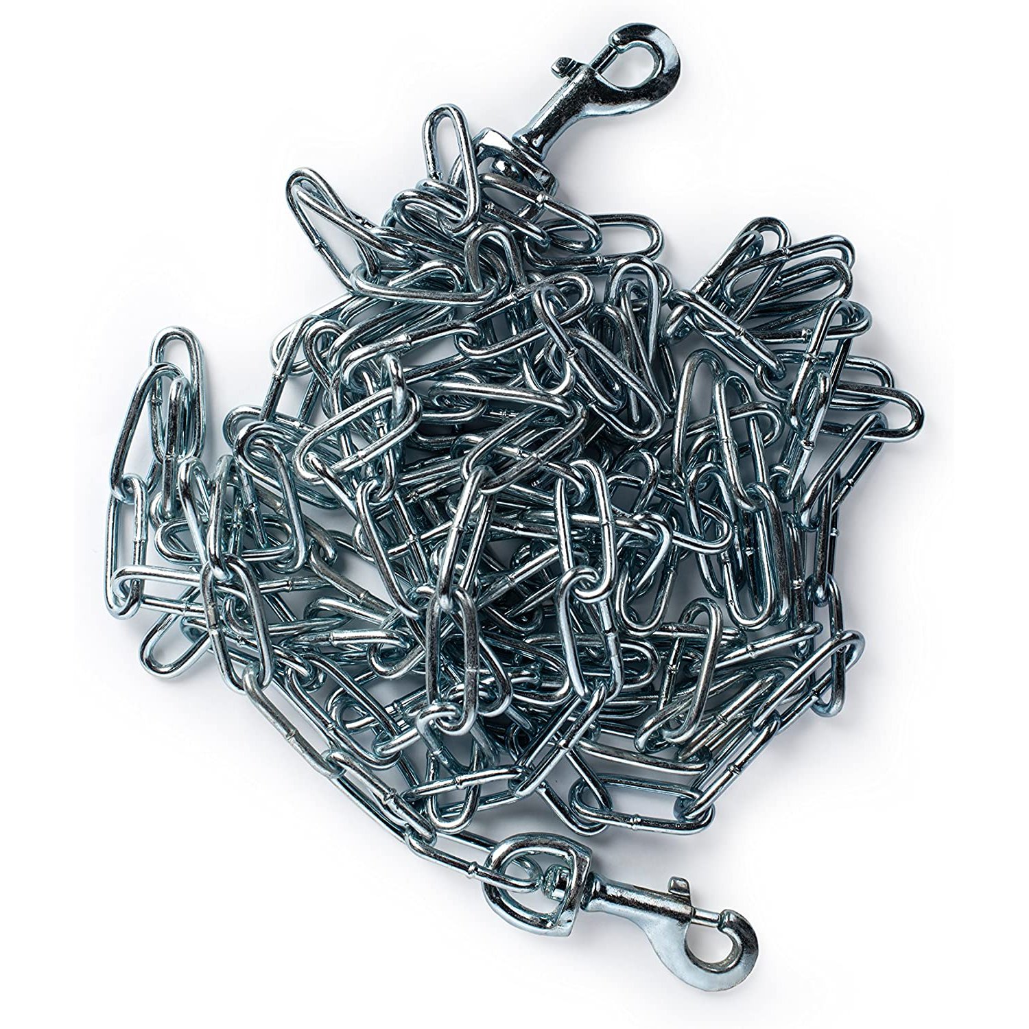 Prevue Pet Products heavy-duty 15' tie-out chain 2116 is designed for dogs up to 150 lbs. Zinc plated welded oval links are strong, ensuring your dog stays safe and secure. Premium quality die-cast iron swivel bolt snaps at both ends connect easily and prevent tangling. Heavy duty tie out chain is 15 foot long and 3.8 mm in diameter.